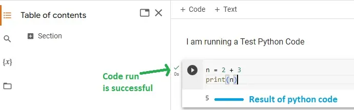 After the run is successful, you can see the green tick indicating the code run is successful and also you can see the results below the code cell.